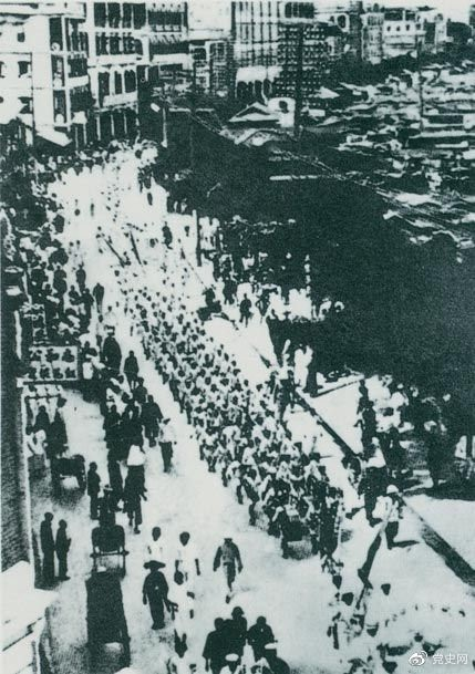 從1925年6月19日起,香港和廣州租界的20萬(wàn)工人舉行罷工,聲援上海人民的反帝斗爭(zhēng)。23日,廣州和由香港回廣州的工人10萬(wàn)余人舉行大游行,在沙基慘遭英、法帝國(guó)主義的鎮(zhèn)壓。圖為當(dāng)時(shí)的游行隊(duì)伍。
